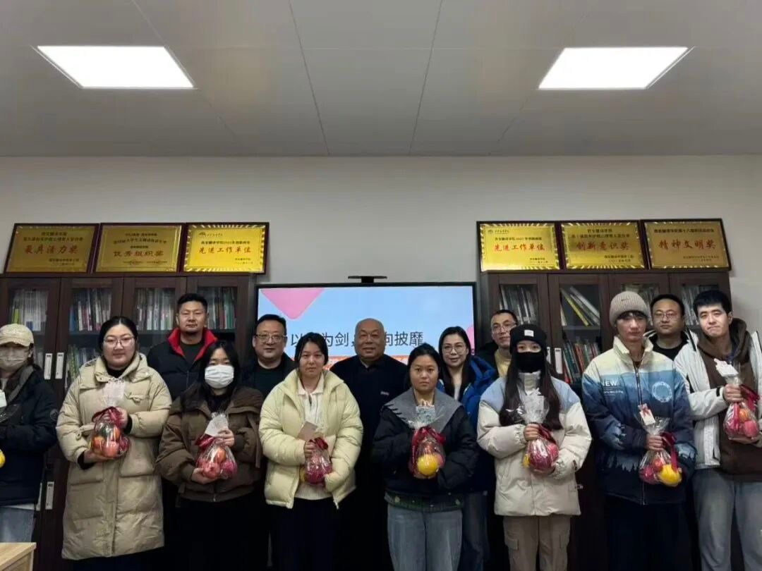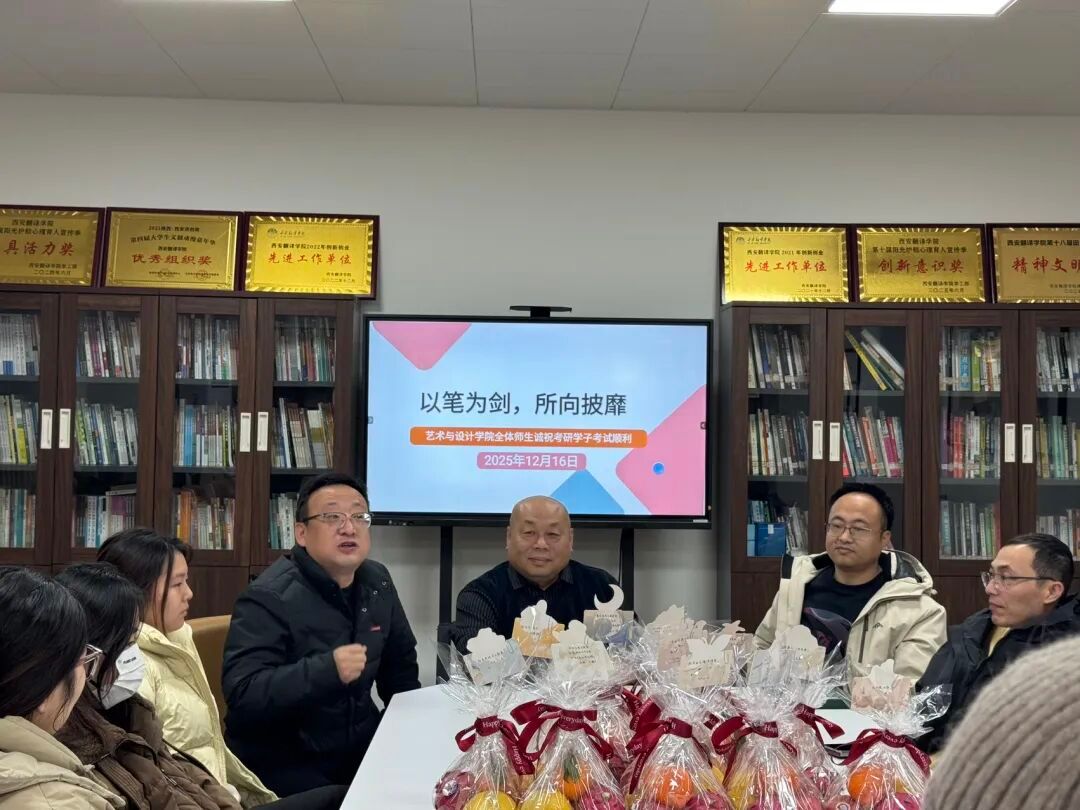 冬意渐浓,梦想升温。随着2026年全国硕士研究生招生考试进入最后冲刺阶段,为帮助考研学子缓解备考压力、提振迎考信心,12月16日,艺术与设计学院在五号楼三楼会议室隆重开展考研送温暖慰问活动。学院院长董千,党委书记、行政副院长徐中,教学副院长吴迪,综合办主任李宁,环境设计系主任刘玉娟,产品设计系主任张军与全体考研学子齐聚一堂,以最真挚的关怀为追梦同学们保驾护航。