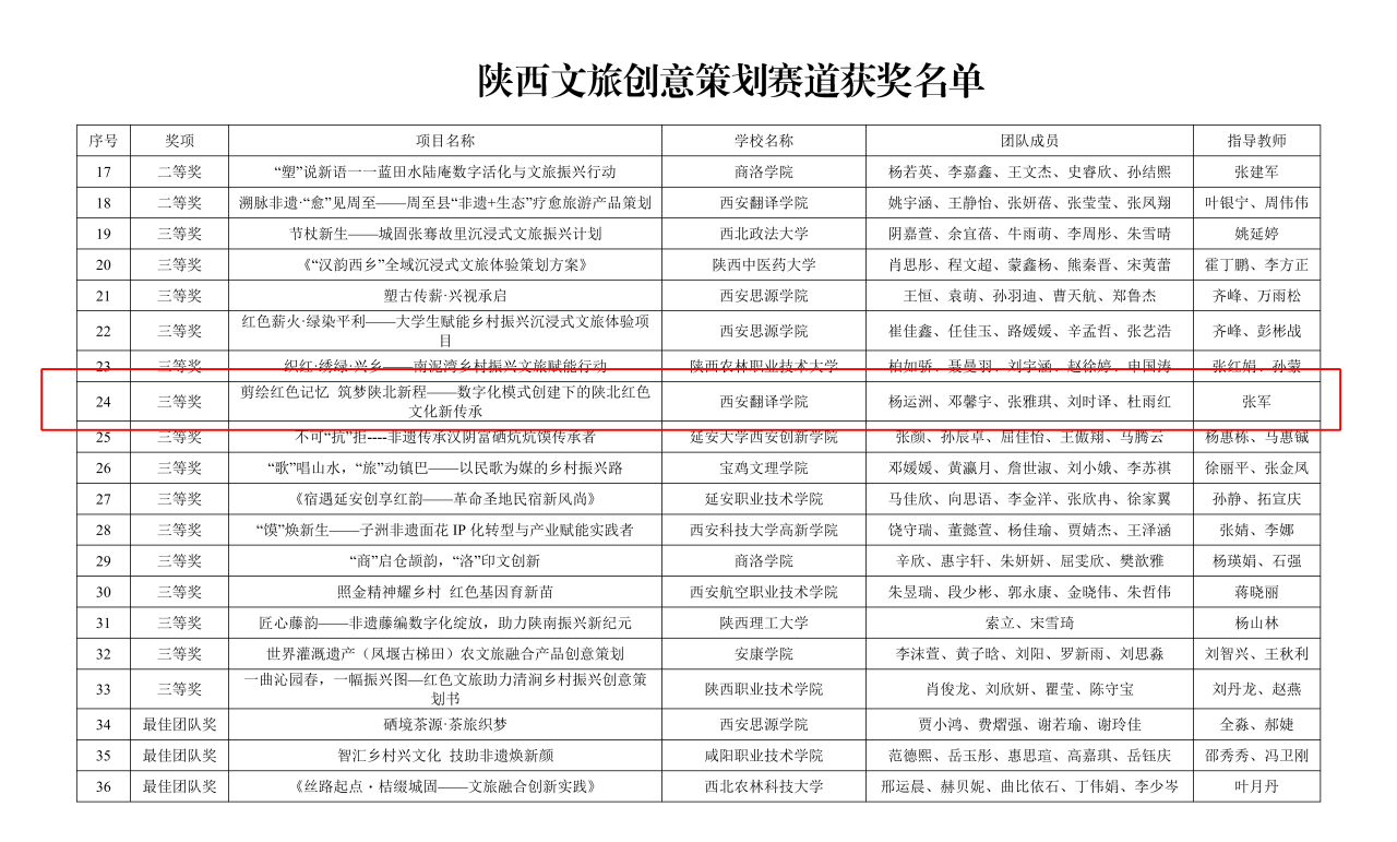 近日,由中共陕西省委教育工作委员会主办、西北政法大学承办的2025年“双百工程”助力乡村振兴·陕西文旅创意策划和农特产品营销推广大赛圆满落幕。本次大赛紧扣时代主题,旨在引导高校学子深入服务地方发展,推动高校智慧与乡村振兴实践深度融合。经过校赛、省级选拔赛与决赛的层层选拔,我院参赛团队表现优异,在两个赛道中共斩获两项省级三等奖,充分展现了艺术与设计在服务地方、实践育人方面的扎实成效与创新活力。